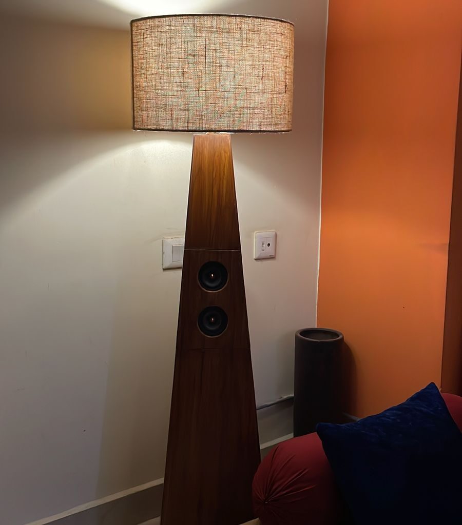 experience warm and clear audio with dual full range drivers and a subwoofer built into floor-standing lamp